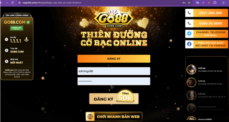 - Đăng nhập vào tài khoản Go88 của bạn tại website: https:// taigo88.poker.